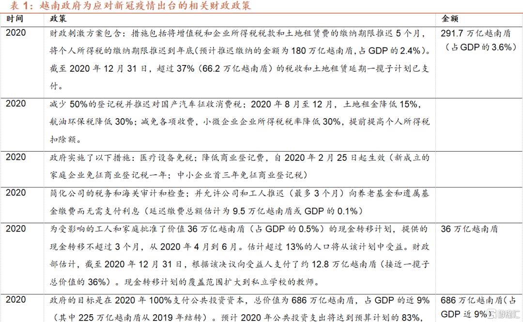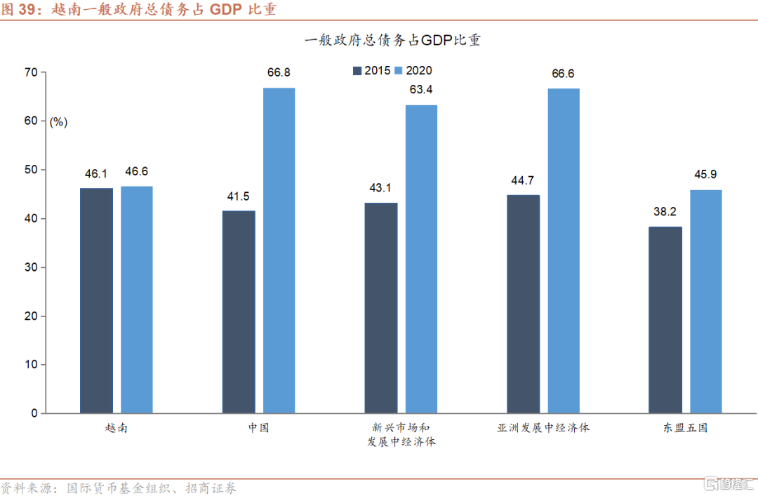 越南近年来基础设施建设资金缺口巨大,越南政府无法独力承担,因而对民营资本和外国投资者参与基建投资持开放态度。越南政府负债水平与其他国家相比尚不算高,根据IMF,越南2020年末一般政府总债务占GDP比重为46.6%,与中国(66.8%)和亚洲发展中经济体(66.6%)相比,仍有一定的上升空间,但与东盟五国(即印尼、泰国、菲律宾、马来西亚和越南)的水平(45.9%)相若。