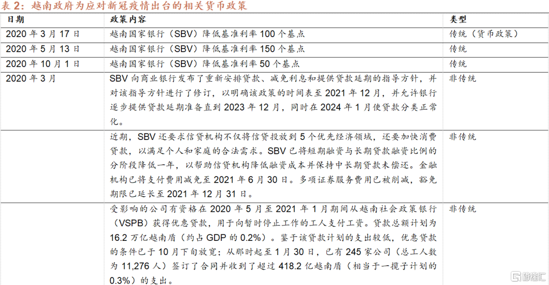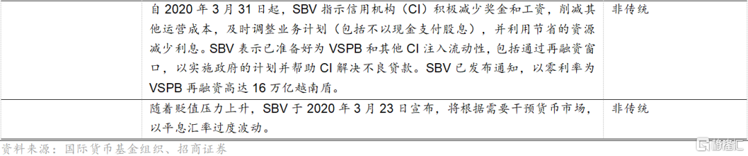 根据《越南国家银行法》,越南中央银行的主要货币政策工具包含以下四种:1)再贷款:主要目的是为信贷机构提供短期贷款以及支付工具;2)利率:主要利率包含再贷款利率、基准利率、及其它利率(如贴现率)。同时,《越南国家银行法》中明确规定了汇率作为越南货币政策工具的地位:越南盾的汇率根据国家调控市场的外币供求情况确定;SBV公布汇率,决定汇率制度和汇率调节机制;3)存款准备金;4)公开市场操作。