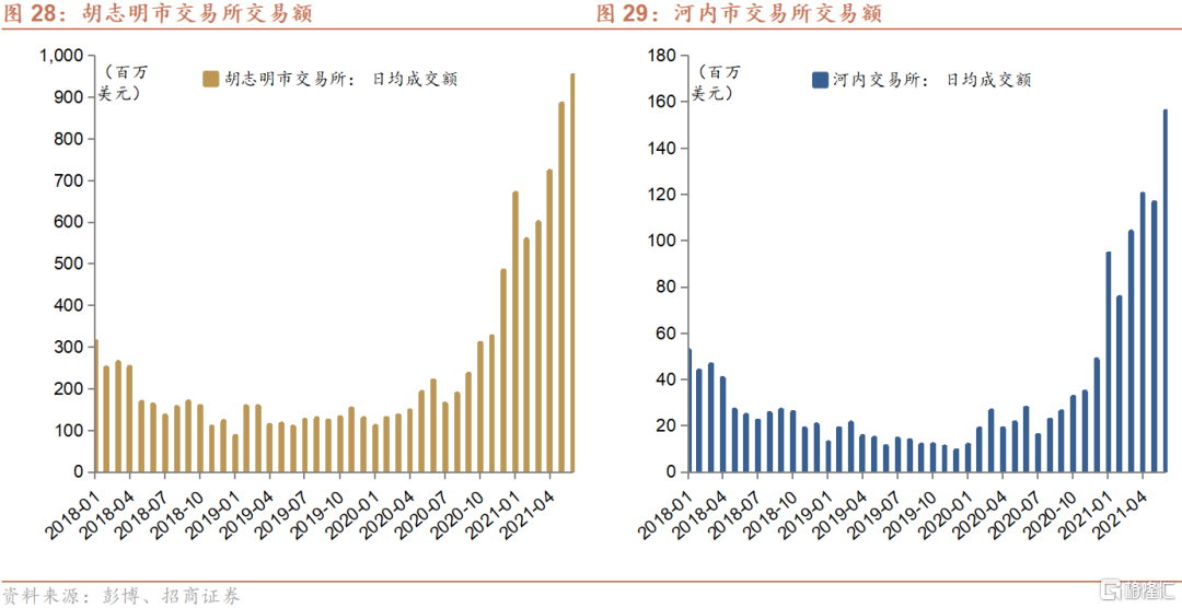 自2020年三季度以来,越南股票市场成交额不断攀升。2020年上半年,胡志明市交易所日均成交额约为1.55亿美元,到2020年四季度达到3.72亿美元;而到2021年6月,日均成交额已经达到了9.52亿美元,较2020年12月直接翻倍。