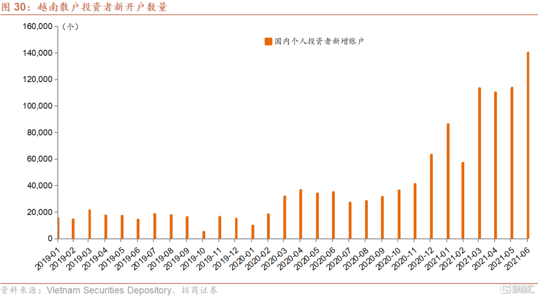 散户投资者的涌入是过去一年多来越南股市不断上涨的主要因素,也推动了成交额的飙升。疫情以来,越南央行维持了宽松的货币政策,在2020年三次下调基准利率累计200bps。银行存款利率的下跌驱使个人投资者将资金转移到股市。2020年全年新增股票开户数达39.2万个,创下历史新高;而在2021年一季度和二季度,又录得了25.6和36.4万个新增账户。截至2021年6月,越南国内个人投资者账户共334万,较2019年底上升43%。