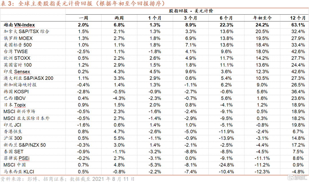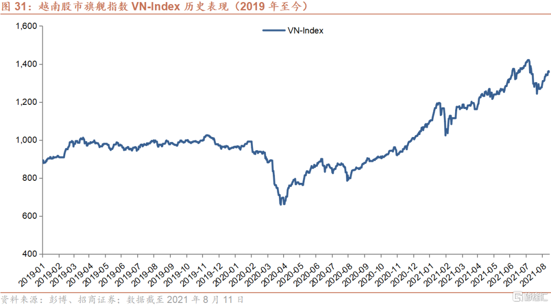 胡志明市交易所指数(VN-Index)为越南股市关注度最高的旗舰指数,该指数为胡志明市交易所上市股票的市值加权平均。自2020年3月24日见底以来,VN-Index不断上涨,截至2021年8月11日累计涨幅达106%。今年以来,VN-Index累计涨幅为24.2%(以美元计价,下同),是全球范围内表现最好的股票市场之一。相比之下,标普500指数、欧洲STOXX指数、日本Topix指数涨幅分别为18.4%、14.2%和1.2%,而恒生指数和沪深300指数分别下跌2.4%和3.1%。VN-Index目前前瞻市盈率为15.6倍,与过去三年历史均值相若(15.7倍)。