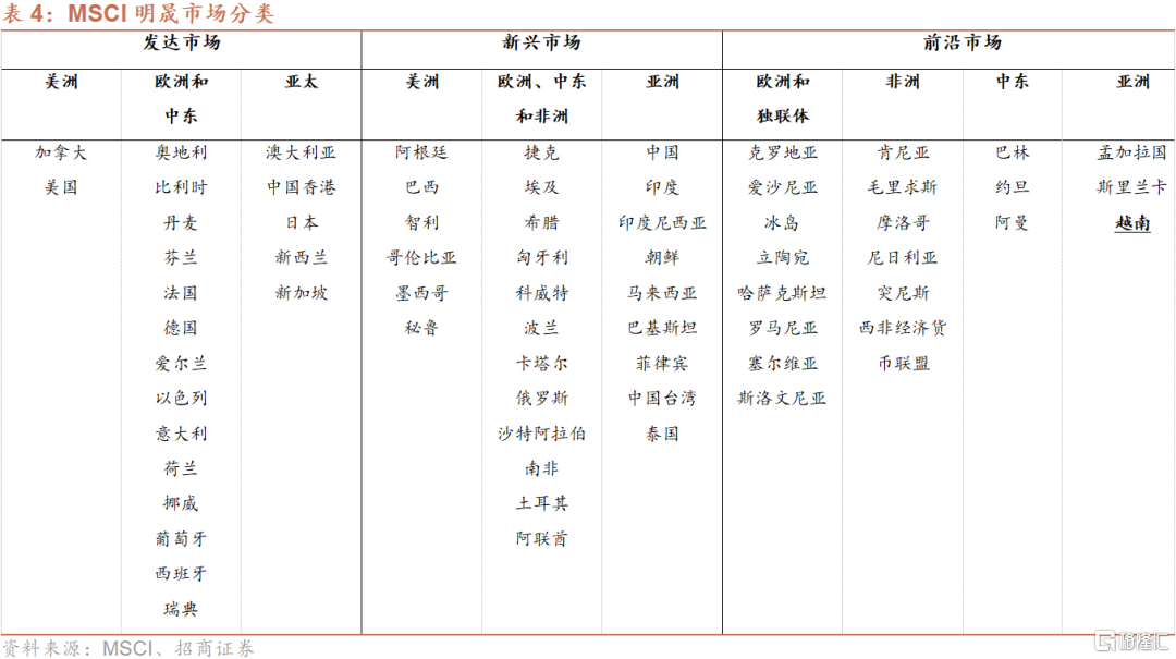 全球最大的指数公司中,MSCI明晟目前将越南市场归类为“前沿市场”(Frontier market);富时罗素目前也将越南市场归类为“前沿市场”,并自2018年9月起列入潜在升级至“二级新兴市场”(Secondary Emerging market)的观察名单中。今年3月,富时罗素宣布维持越南市场为“前沿市场”的地位不变。