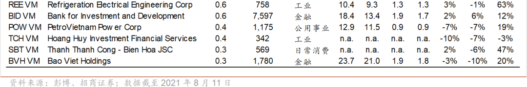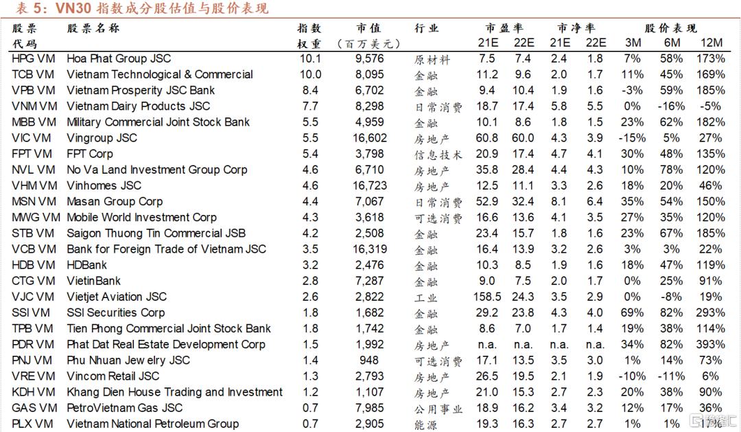 金融行业主要标的有Vietnam Technological and Commercial Joint Stock Bank (TCB VM)、Vietnam Prosperity JSC Bank (VPB VM)、Military Commercial Joint Stock Bank (MBB VM)等银行。房地产行业主要标的有Vingroup JSC (VIC VM,越南最大综合型企业,主要业务包括房地产、工业、零售和医疗保健等)、No Va Land Investment Group Corp (NVL VM,越南第二大房地产开发商)、Vinhomes JSC (VHM VM,越南最大的商业房地产开发商,Vingroup的子公司)等。日常消费行业主要标的有Vietnam Diary Products JSC (VNM VM,越南乳业领头羊,液态奶和奶粉产品市占率分别为54%和41%)及Masan Group (MSN VM,越南最大民营企业之一,主要业务包括调味料和方便面等)。原材料行业的主要标的为Hoa Phat Group JSC (HPG VM),该公司为越南最大的钢铁企业。此外还有信息技术行业的FPT Group (FPT VM),该公司为越南最大的信息技术服务公司,核心业务为ICT相关的服务。
