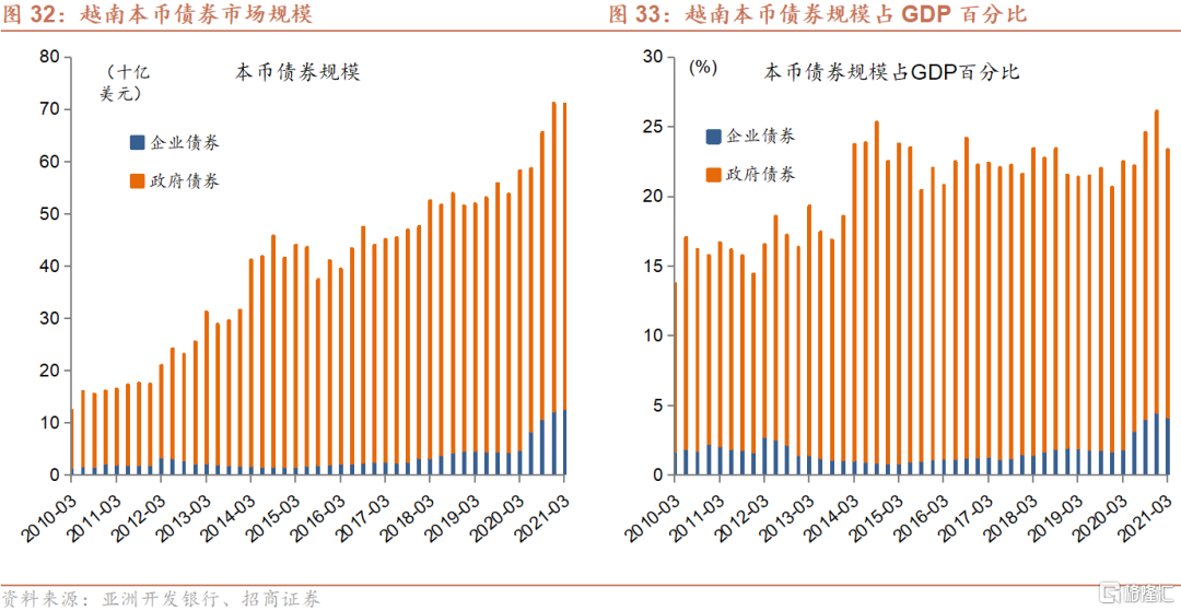 过去十年,越南债券市场经历了显著稳步发展。本币债券规模在2020年末达到711亿美元,较2010年末增长344%,年均复合增长率为16%。2020年末,本币债券占GDP的百分比为26.1%,较2010年末提升10.4个百分点。与东盟其他发展中国家相比,越南本币债券规模占GDP的百分比仍然相对较为落后,不及印尼(29.3%)、菲律宾(47.8%)、泰国(88.7%)和马来西亚(119.4%)。