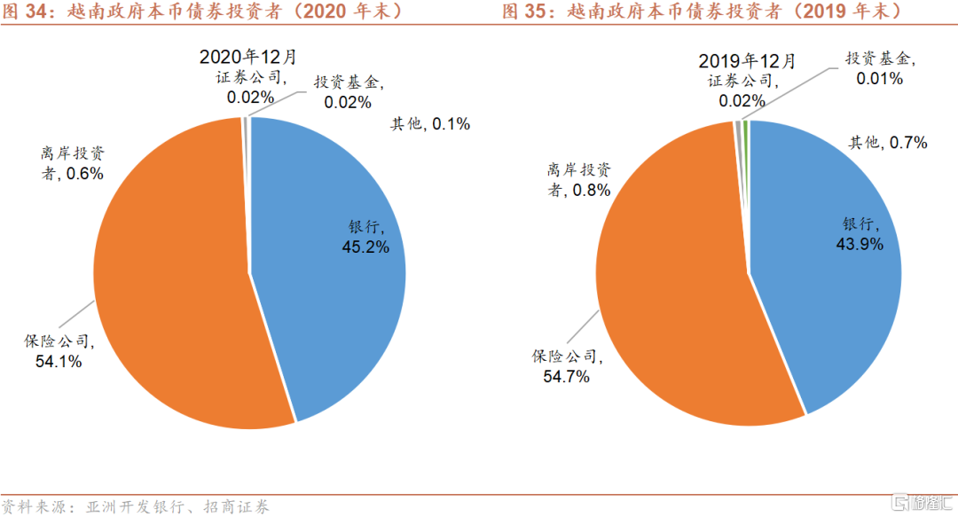 从债券投资者来看,2020年末,越南国内保险公司和银行几乎持有全部存量政府债券,合计占比近99.3%,其中保险公司持有54.1%(2019年末:54.7%),银行则持有45.2%(2019年末:43.9%)。其余政府债券投资者包括证券公司、投资基金、离岸投资者等。2020年末,外资投资者持有政府债券的0.6%,几乎是新兴东亚经济体中的最小份额。