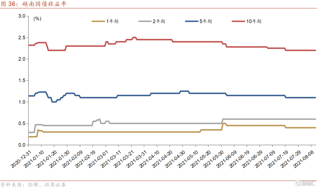 股票市场:越南的股票交易所规模小、上市公司数量少且市值偏低。胡志明市与河内交易所合计共有38家公司市值超过10亿美元;另有122家介于1亿和10亿美元之间。越南政府正在推动成立越南证券交易所以统一管理两家证券交易所。未来所有挂牌股票将转移至胡志明市交易所,而河内交易所将负责政府债券和衍生品的交易。越南限制上市公司外资持股比例为49%,银行等个别行业外资持股比例为30%。我们认为越南有望逐步加大股票市场的规模,并放宽对外资的限制。同时,对交易所进行现代化、数字化的改造势在必行,目前疲弱的交易所基础设施已经成为交易量进一步上升的障碍。越南股市自去年3月见底以来,至今涨幅近乎翻倍,今年以来几乎是全球范围内表现最好的股票市场之一。越南央行从疫情以来维持了宽松的货币政策,银行存款利率的下跌驱使个人投资者将资金转移到股市。散户的涌入在推动股市上涨的同时导致越南股票市场成交额不断攀升,2021年6月的日均成交额较2020年12月直接翻倍。由于交易流水太大,胡志明市交易所的交易系统不堪重负,曾在今年6月暂停交易半日,导致市场短期波动加剧。