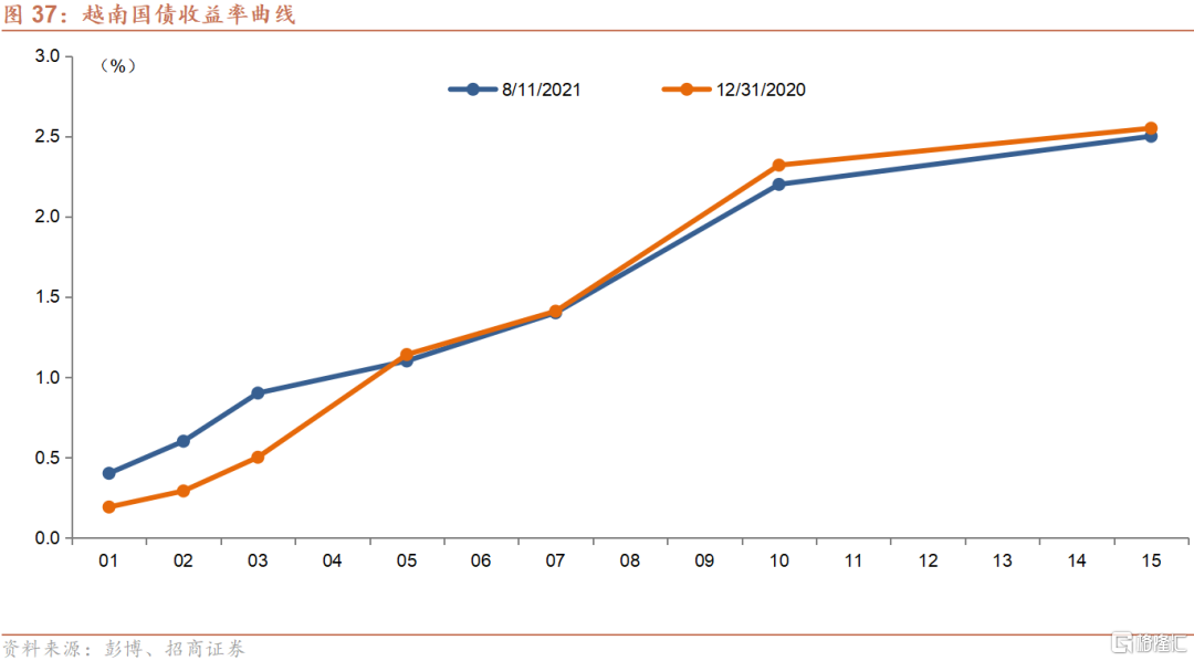 年初至今,越南长端国债收益率并无显著变化,10年期和15年期国债收益率分别下跌12bps和5bps。短端收益率则略微上行,1年期、2年期和3年期国债收益率分别上升21bps、31bps和40bps。