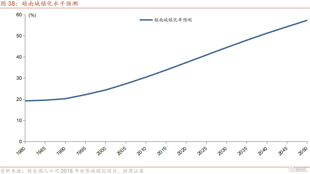 目前越南的城镇化率为36.8%,相当于中国2001年的水平。根据联合国经济和社会事务部人口司在2018年的预测,越南的城镇化率将在2030年达到44.5%,在2050年达到57.3%。人口的不断城镇化有望带动越南的房地产市场发展,也带来更多对基础设施投资的需求。