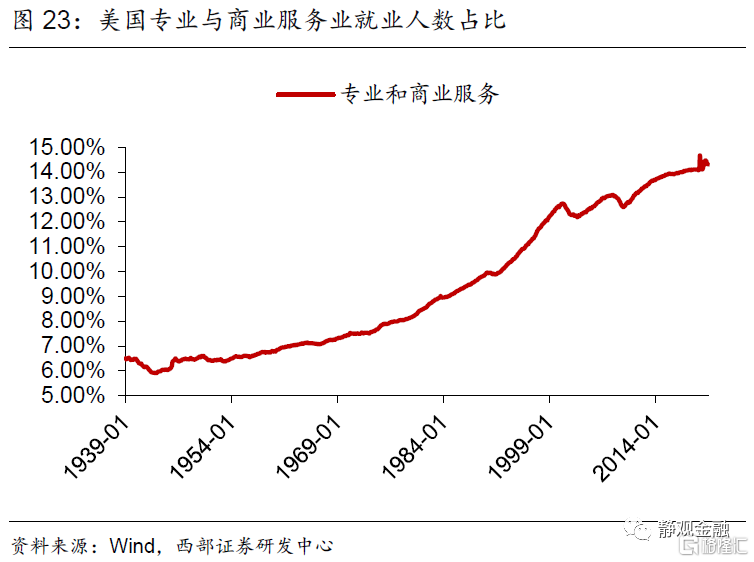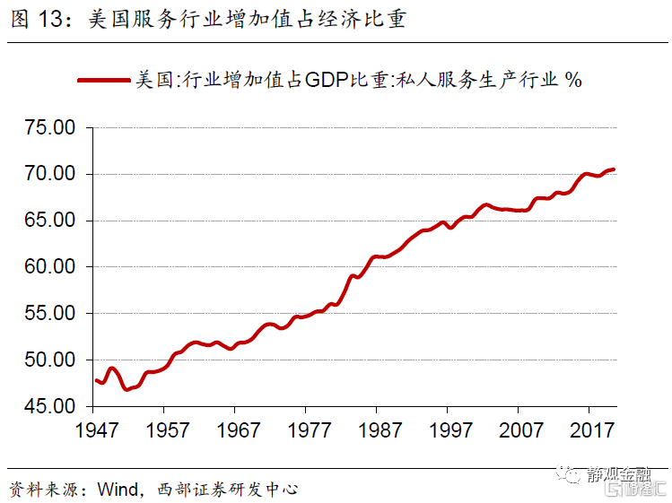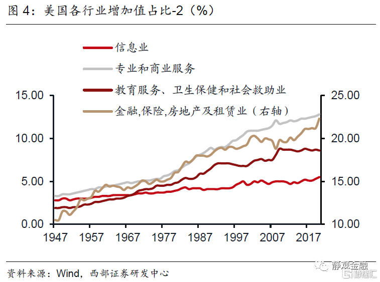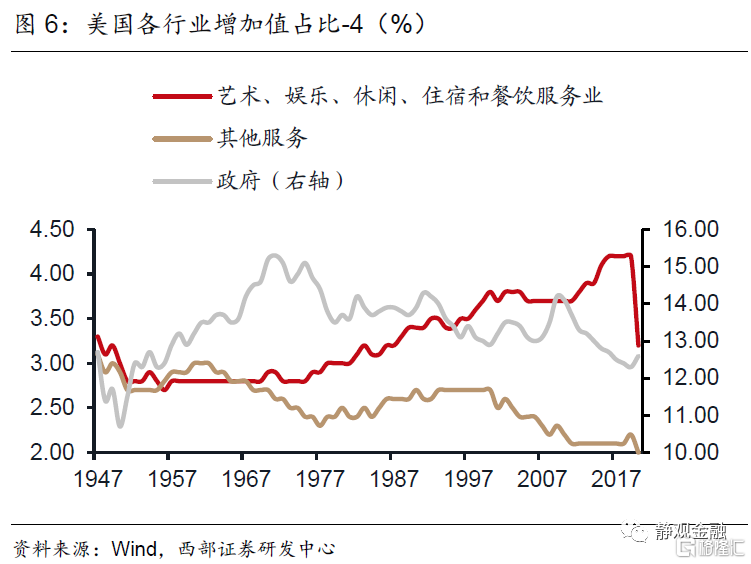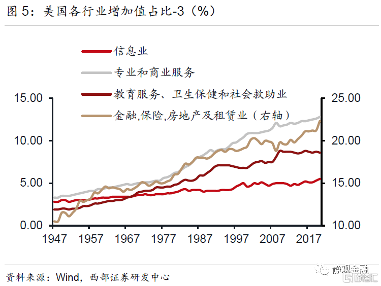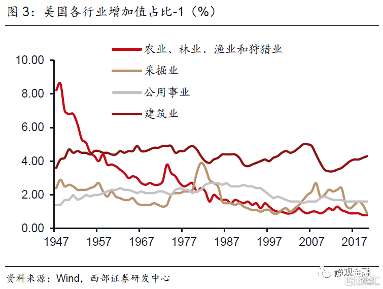 如图3-6所示,二战以来美国产业结构变化极大。1950-2019年多数服务行业占比上升:金融、保险、房地产及租赁业占比由11.5%升至21.2%,专业和商业服务业占比由3.5%升至12.6%,教育服务、衞生保健和社会救助业占比2.0%升至8.7%,信息业占比由3.0%升至5.3%,艺术、娱乐、休闲、住宿和餐饮服务业占比由3.0%升至4.2%。相比之下,50-60年代农业占比由6.8%降至3%,50-70年代运输及仓储业占比由5.7%降至3.7%,70年代以来制造业增加值占比由22.7%降至10.8%。