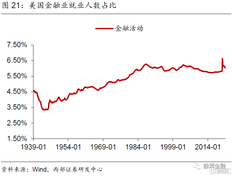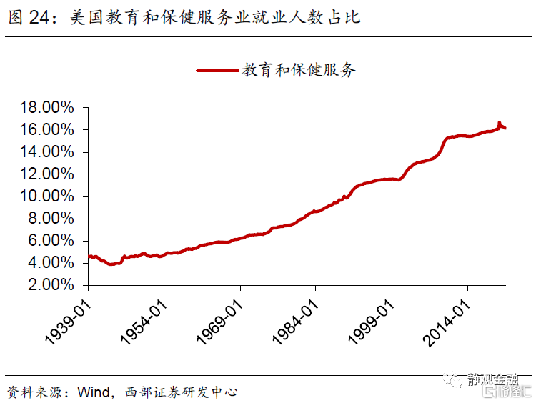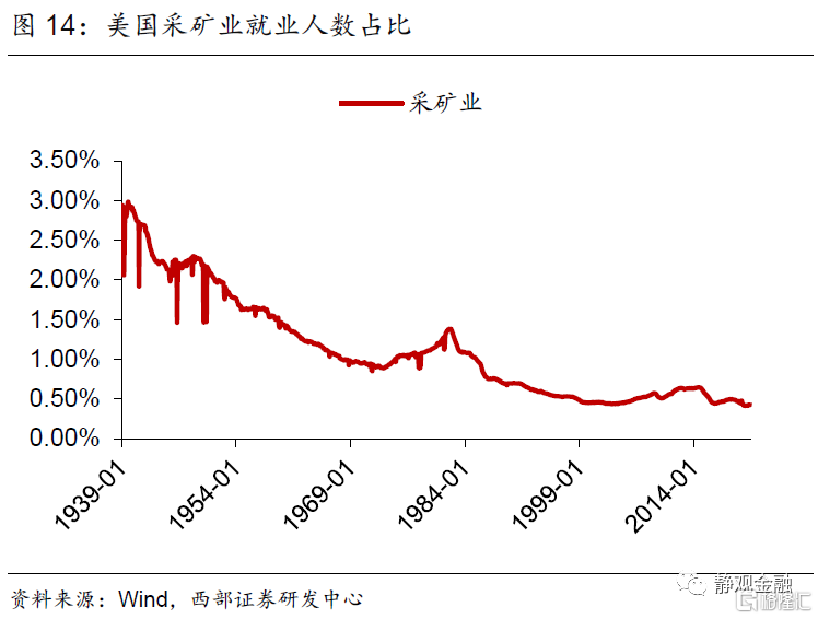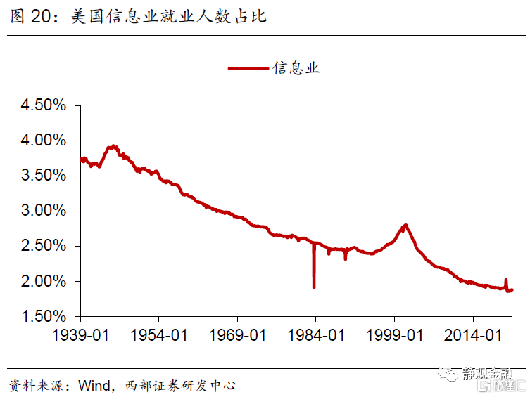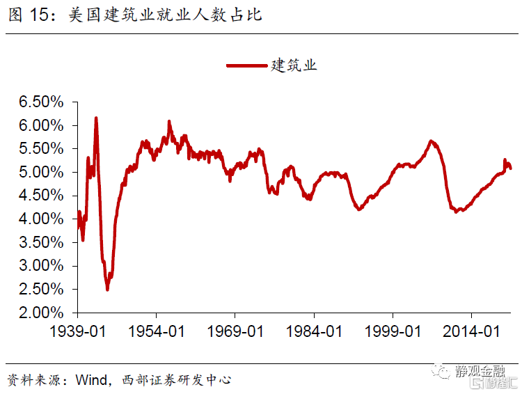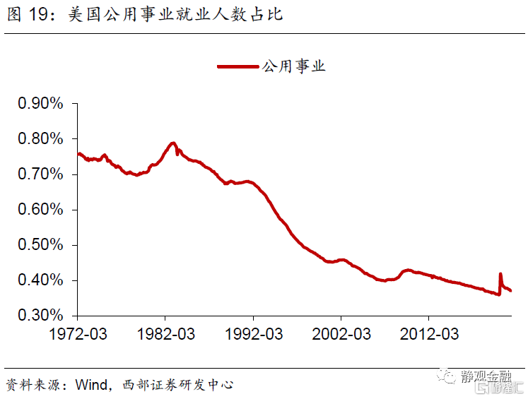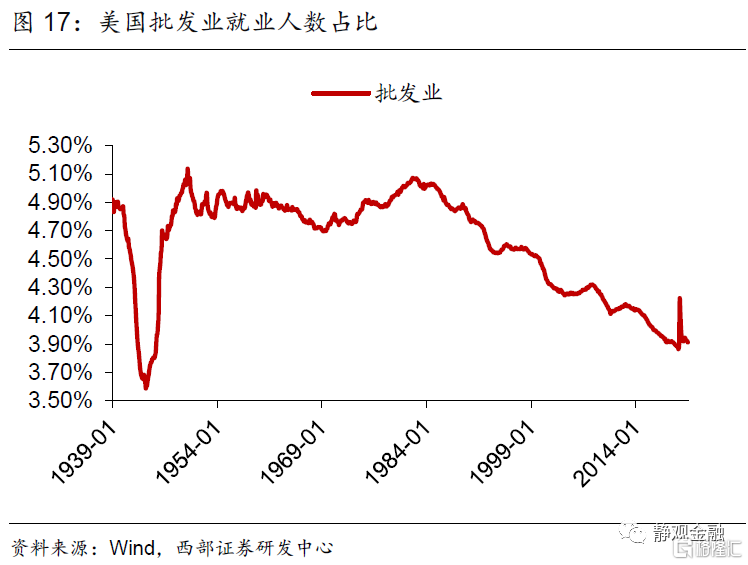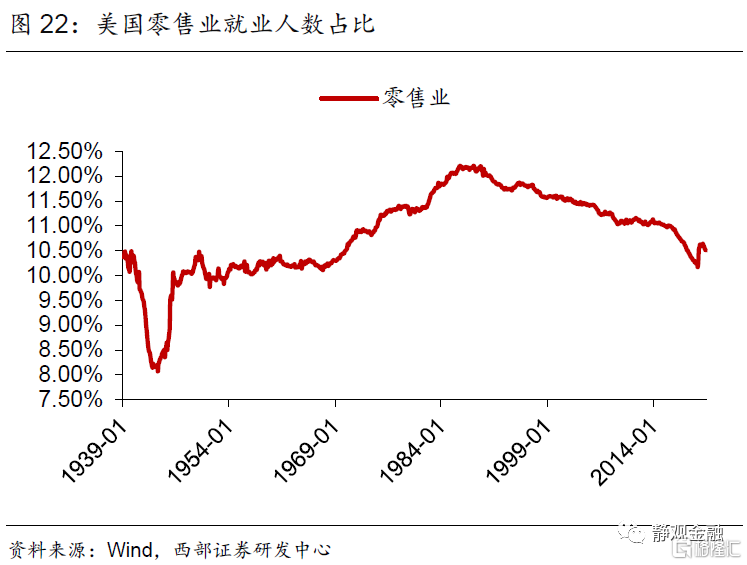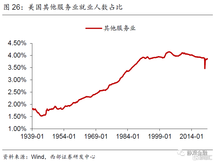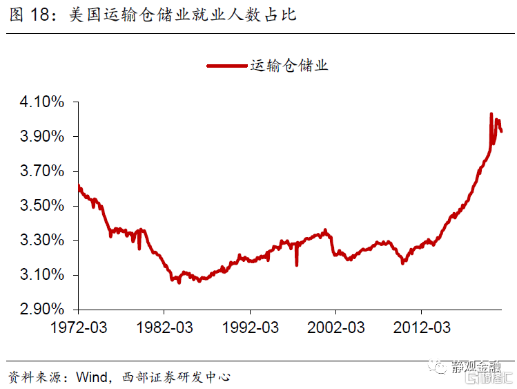 首先,二战后服务业占比持续上升的趋势以及不同经济周期增长动能的差异令美国各同行业吸收就业能力随之变化。70年代以来休闲酒店业就业人数占比以年均近0.1%的增速攀升。1982年经济衰退后采矿业、批发业及公用事业就业人数占比均进入下降趋势。1990年起美国零售业就业人数占比进入下降趋势、同期其他服务业就业人数占比结束升势。科网泡沫破灭后信息业从业人数占比再度进入下降趋势。金融危机后制造业就业人数占比下滑趋势被遏制、专业及商业服务领域就业人数占比再度持续攀升、教育及保健服务就业人数占比升势趋缓。此外,建筑业就业人数占比呈现周期波动;运输业就业人数占比有两轮上升趋势,分别发生在1982年经济衰退后以及金融危机后;二战后金融业就业人数占比持续上升的趋势在1987年结束。