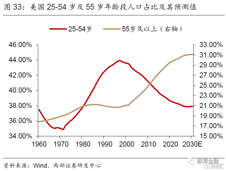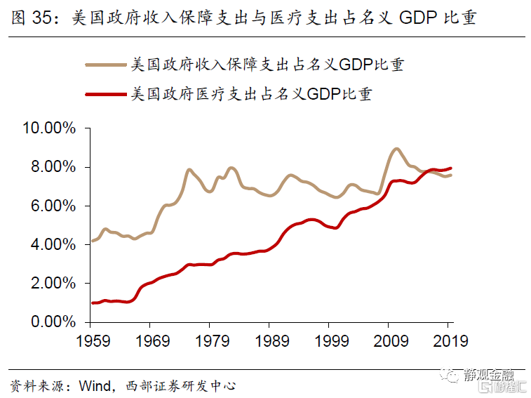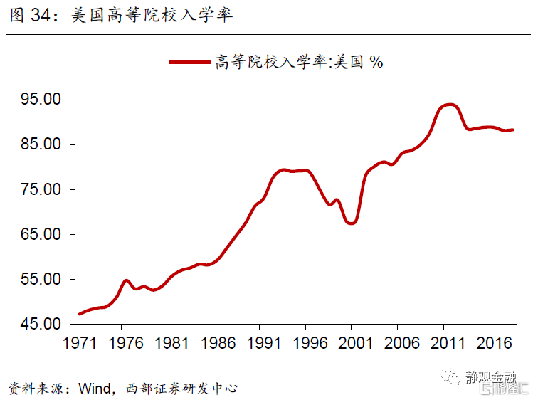 其次,2000年以来社会受教育程度提高以及老龄化程度加深等因素一直在掣肘劳动力参与率,并且金融危机后上述影响更趋明显。25-54岁群体的就业参与率高于80%,但55岁及以上群体则仅为30-40%,2000年以来特别是金融危机后55岁及以上人口占比大幅攀升是美国劳动力参与率回落的主因之一。图34所示,2000年后美国高等院校入学率持续攀升,这也是同期15-24岁年龄段就业参与率下降的合理解释。此外,金融危机后美国收入保障与医疗支出占比增加也在一定程度上削弱了部分25-54岁年龄段群体的就业意愿。