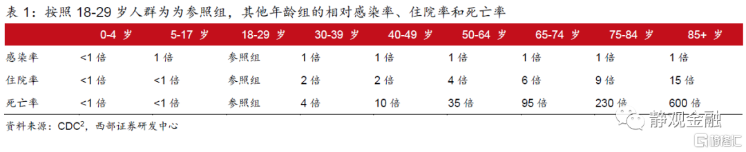 去年以来每波疫情反弹对美国经济的冲击已经逐次减弱,但是该因素对民众心理和行为的影响恐怕仍会延续。我们在8月15日的报吿《怎么看美国主客观数据的背离?》中指出8月密歇根大学消费者信心指数骤降就是在财政转移支付结束的前提下疫情波动加剧了中低收入群体不安所致:出门就业就可能增加感染风险、不出门就业就要坐吃山空。事实上,如表1所示新冠疫情对不同年龄段群体的影响也存在较大差异,年龄越大感染风险和重症风险越高,并且50+岁群体的确诊概率呈现指数级别攀升。假若疫苗并不能显著降低感染风险,那么部分50+岁年龄段群体就有可能提前退休离开就业市场,这将令美国参与就业的劳动力整体稍微“年轻化”。