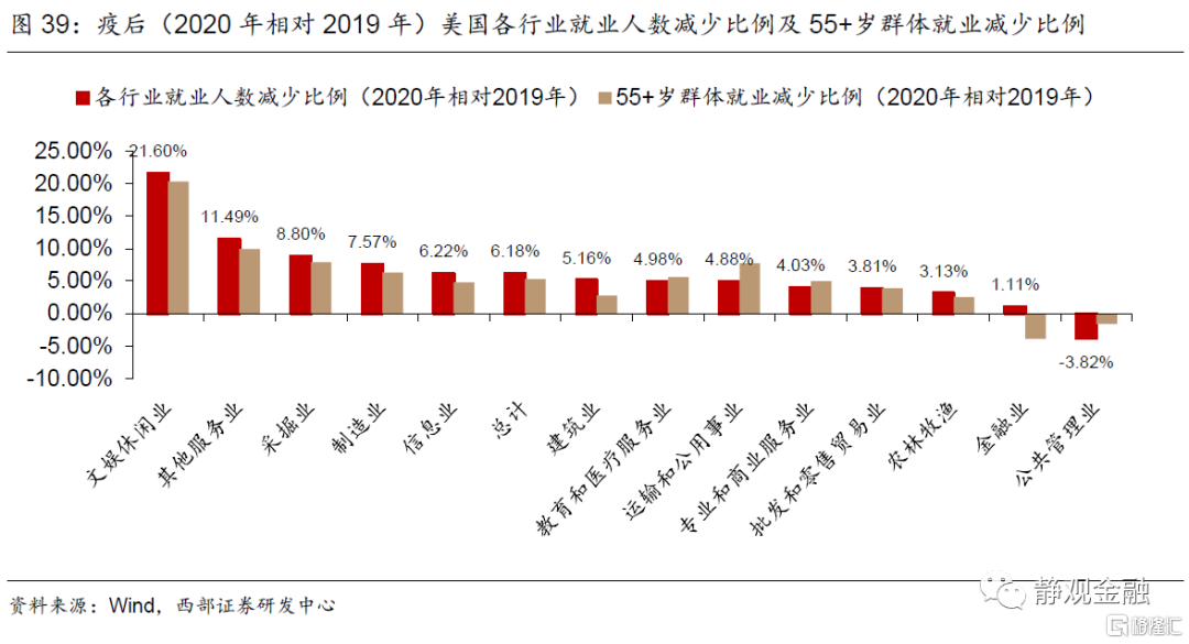 表2-3显示,疫情前美国55+岁年龄段群体就业主要集中在两个方面:一是时薪偏低的服务行业,如零售、文娱休闲与其他服务业;二是有技术门槛需要经验的专业服务行业,比如教育医疗、金融以及专业与商业服务领域。此外,(传统)制造业中55+岁年龄段群体占比也偏高。由图39可知,疫后各行业中55+岁就业人数减少幅度高于整体就业人数减少幅度的行业包括教育和医疗服务、运输与公用事业、专业和商业服务以及批发零售贸易。此外,疫后就业人数减少幅度较大两个行业为文娱休闲与其他服务业。我们猜测为了降低感染风险,未来一段时间内就业恢复期,回归这两大行业的就业人群也极有可能以中低年龄段为主。也就是说,我们认为未来若干年美国更为“年轻化”的行业基本以金融、公共管理以外的服务行业为主。