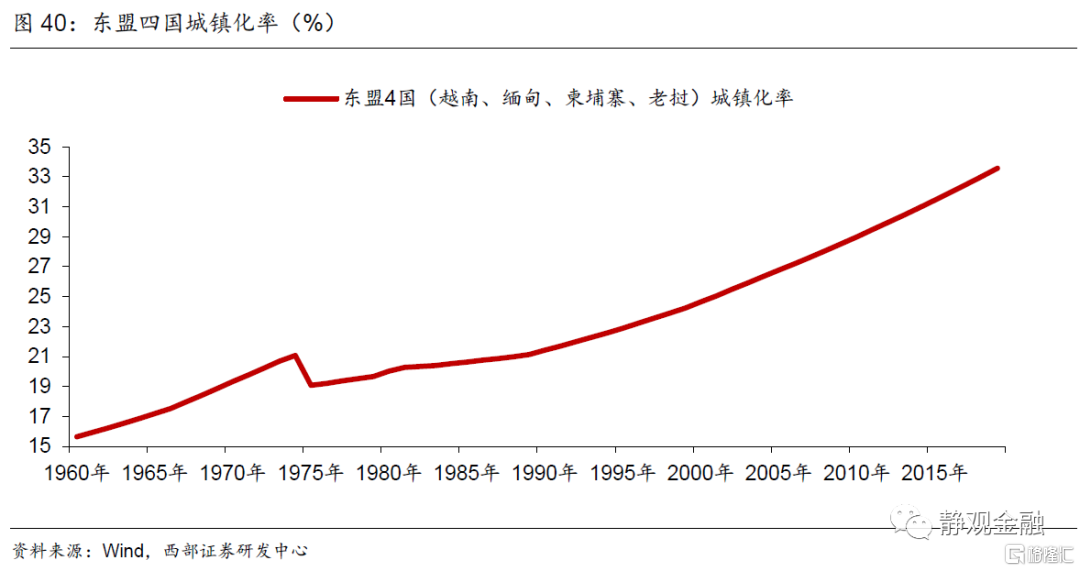二战后全球经历了三轮半产业转移:二战后,全球已经经历了三轮产业转移:50-60年代美国中低端产业向德国及日本等国转移;上世纪70-80年代日德中低端产业向亚洲四小龙和亚洲四小虎转移;上世纪90年代至2010年全球中低端产业向中国转移。金融危机后,全球正在发生第四轮产业转移,也即:中国中低端产业向东盟产业承接国(越南、老挝、缅甸、柬埔寨)等经济体转移,同时中国承接全球中高端产业。每一轮全球产业转移历经20年,且可以分为上半场和下半场,各10年。上半场为中低端产业承接前期,产业承接国逐渐由中低收入国家跃升为中等或中高收入国家;下半场产业承接后期,产业承接国伴随一轮消费升级:衣食消费转向住行消费。每一轮产业转移由上半场切换到下半场的标志就是产业承接国城镇化率突破30%进入加速攀升阶段。