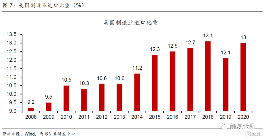 美国从贸易顺差走向贸易逆差是产业转出、制造业占比下降的结果,但制造业占比回升未必可以缓解美国贸易逆差扩张压力。首先,美国制造业占比上升并非制造业回流而是新兴制造业产业扩张的结果,但同一时期中国、欧盟等大型经济体都在推动绿色经济与数字化经济,也就是说各经济体将处于新兴产业竞赛阶段。该阶段与发展新兴产业相关的资源需求将快速扩张。加上全球正在进入二战后第四轮产业转移下半场等因素,未来8-10年全球将处于温和通胀状态。换言之,金融危机后的低通胀状态或已结束,今后数年全球通胀中枢将有所抬升。其次,拜登政策大概率将降低美国新兴产业领域的对外依赖度,但传统制造业对外依赖、房地产上升周期以及页岩油供给减少后再次出现原油贸易逆差的前景都表明美国整体贸易逆差难以收敛。