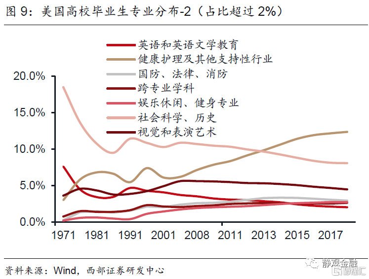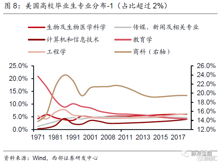与此呼应的是白宫于3月31日公布的《美国人就业计划》及4月28日公布的《美国家庭计划》。5月以来拜登谋求与共和党达成共识的1万亿美元基建计划及或于2022财年推动的3.5万亿美元预算案基本以“就业计划”及“家庭计划”为蓝本。假若上述政策可按预期落地,则美国政府将在未来8年给予新能源领域约3770亿美元财政支持、给予传统基建约3740亿美元财政支持。此外,侧重社会保障的“家庭计划”似乎包含了两重意义:一方面试图通过财政转移支付缩小贫富差距;另一方面则通过教育支持为美国新产业发展输送专业人才。结合图3-6及图8-9可知,美国各行业发展与高校毕业生专业分布存在极其显著的正反馈循环,但理论上也都会体现政策倾向性。也就是说,“就业计划”与“家庭计划”相当于拜登政府为今后美国新兴产业发展提供了资金、硬件及人才等全方位的规划与保障。
