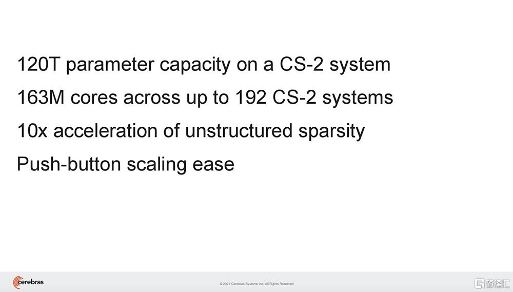 Weight Streaming建立在WSE超大尺寸的基础上,其计算和参数存储完全分离。通过与最高配置2.4PB的存储设备MemoryX结合,单台CS-2可支持运行拥有120万亿个参数的模型。