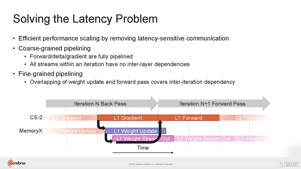这种无需分区就能适应片上内存中每个模型层的能力,可以被赋予相同的神经网络工作负载映射,并独立于集群中所有其他CS-2对每个层进行相同的计算。