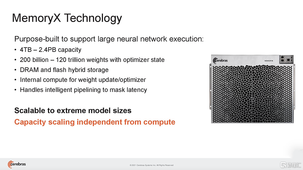 (2)Cerebras MemoryX:一种内存扩展技术,为WSE-2提供高达2.4PB的片外高性能存储,能保持媲美片上的性能。借助MemoryX,CS-2可以支持高达120万亿参数的模型。