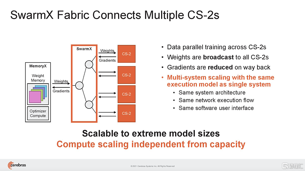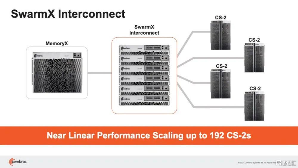 SwarmX结构既做通信,也做计算,能使集群实现接近线性的性能扩展。这意味着如果扩展至16个系统,训练神经网络的速度接近提高16倍。其结构独立于MemoryX进行扩展,每个MemoryX单元可用于任意数量的CS-2。