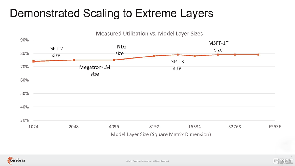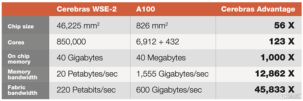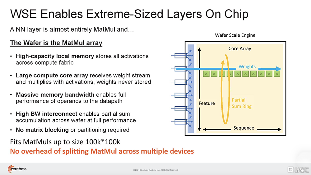 与GPU不同,GPU的片上内存量很小,需要跨多个芯片分区大型模型,而WSE-2足够大,可以适应和执行超大规模的层,而无需传统的块或分区来分解。