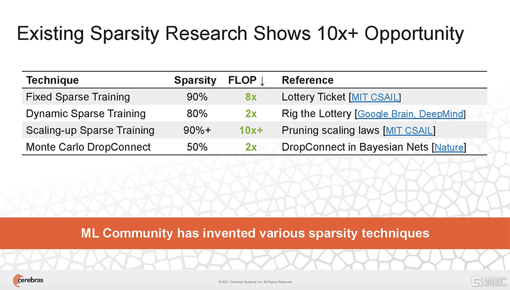 Cerebras架构特有的数据流调度和巨大的内存带宽,使此类细粒度处理能加速动态稀疏、非结构化稀疏等一切形式的稀疏。结果是,CS-2可以选择和拨出稀疏,以产生特定程度的FLOP减少,从而减少应答时间。