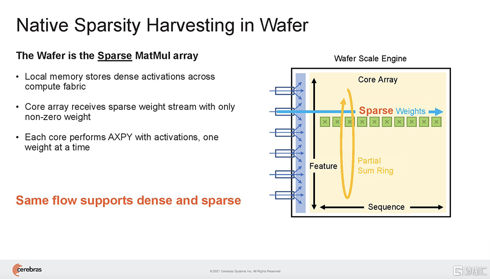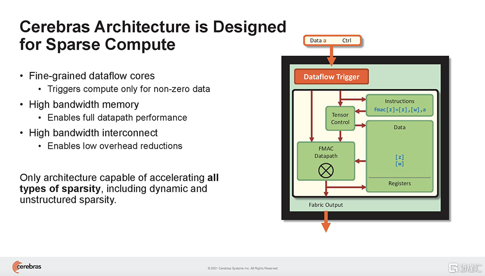 Cerebras WSE基于一种细粒度的数据流架构,专为稀疏计算而设计,其85万个AI优化核能够单独忽略0,仅对非0数据进行计算。这是其他架构无法做到的。