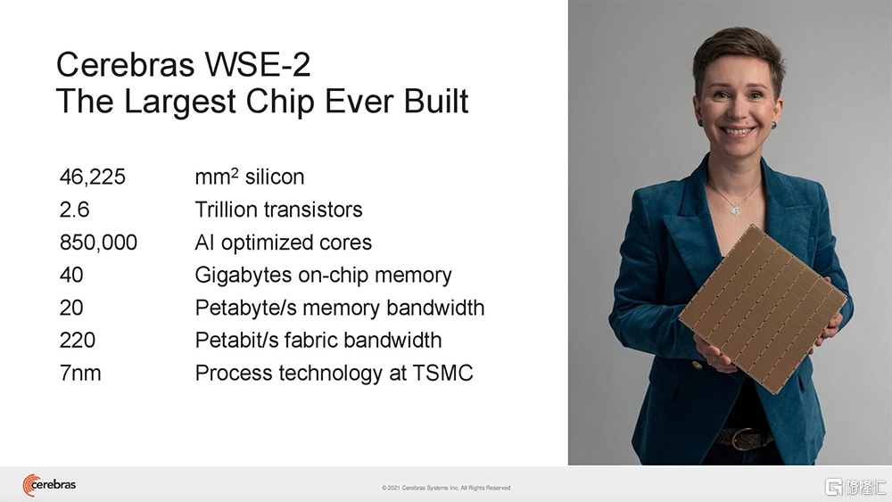 WSE-2采用7nm工艺,是一个面积达46225平方毫米的单晶圆级芯片,拥有2.6万亿个晶体管和85万个AI优化核,无论是核心数还是片上内存容量均远高于迄今性能最强的GPU。