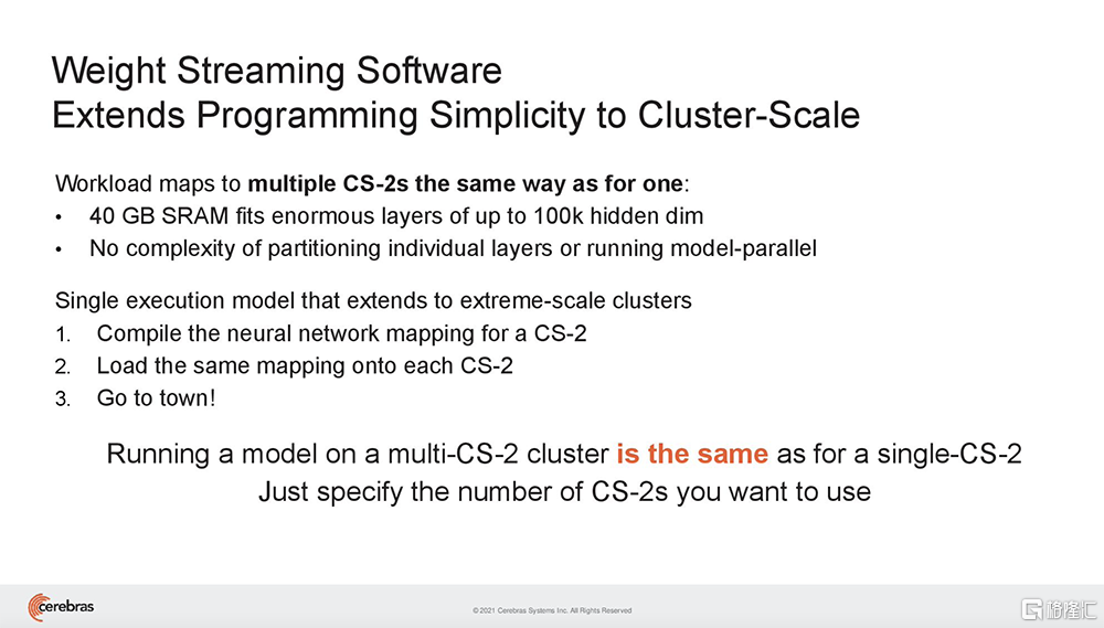 这带来的好处是,用户无需进行任何软件更改,就能很方便地将模型从运行在单台CS-2上,扩展到在任意大小的集群上。也就是说,在大量CS-2系统集群上运行AI模型,编程就像在单台CS-2上运行模型一样。
