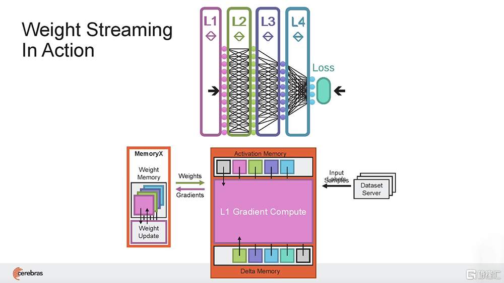 在Weight Streaming中,模型权重存在中央芯片外存储位置,流到晶圆片上,用于计算神经网络的每一层。在神经网络训练的delta通道上,梯度从晶圆流到中央存储区MemoryX中用于更新权重。