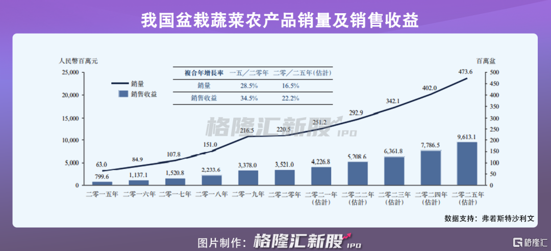 数据显示,预计盆栽蔬菜农产品的销量可能于2025年达到4.74亿盆,复合年增长率约为16.5%。预计其销售收益将于2025年增至96.13亿元,复合增长率约为22.2%。