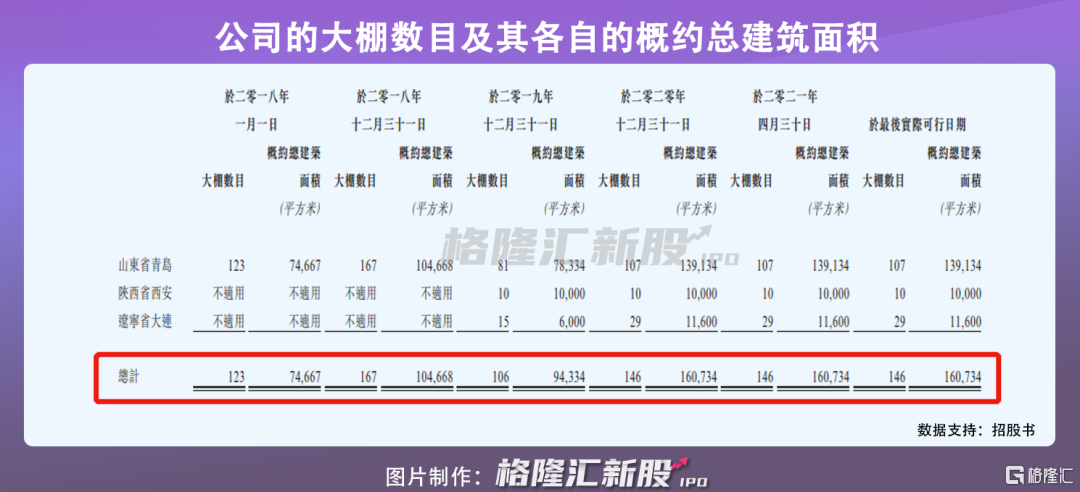 事实上,公司拥有三个盆栽蔬菜农产品的种植基地,包括莱西基地、西安基地及大连基地,得益于其产品需求的持续增长,公司的大棚数目和各自的概约总建筑面积整体有所扩大,招股书显示,公司拥有146个大棚,总建筑面积约为16.07万平方米。