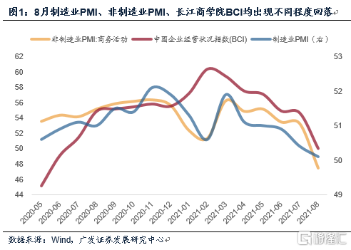 第一,8月中采制造业PMI、非制造业PMI、长江商学院BCI指向一致,均出现不同程度回落。