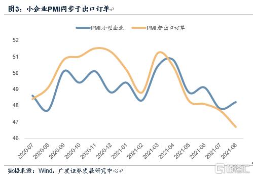 其中大企业PMI变化比较剧烈,中小企业实际上还略高于7月,我们猜测和同期原油价格触顶回落对上下游的影响有关。从历史数据看,一个经验规律是大企业PMI同步于油价,小企业PMI同步于出口订单。