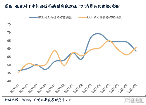 第五,同样逻辑之下,企业对于中间品价格的预期依然强于对消费品的价格预期。BCI消费品价格前瞻指数回落,而中间品价格前瞻指数上升。从微观层面看,工业品价格通胀预期尚未有实质性缓和。