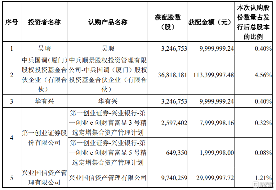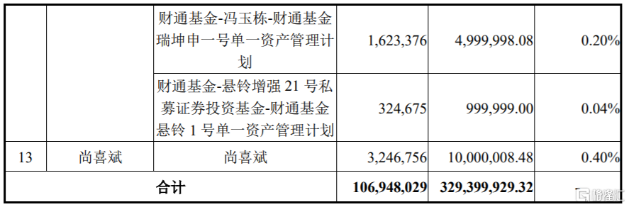 格隆汇9月6日丨日上集团(002593.SZ)公布非公开发行股票发行情况报告暨上市公告书,此次非公开发行新增股份1.07亿股,将于2021年9月8日在深圳证券交易所上市。此次非公开发行价格3.08元/股,募集资金净额为人民币3.18亿元。确定发行对象13家,发行认购情况如下: