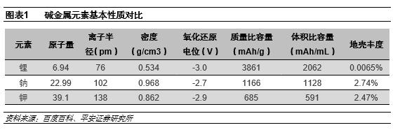 近期以宁德时代和中科海钠为代表的企业开始布局钠离子电池,有望推动钠离子电池的商业化进程。锂、钠、钾同属于元素周期表ⅠA族碱金属元素,在物理和化学性质方面有相似之处,理论上都可以作为二次电池的金属离子载体。锂的离子半径更小、标准电势更高、比容量远远高于钠和钾,因此在二次电池方面得到了更早以及更广泛的应用。但锂资源的全球储量有限,随着新能源汽车的发展对电池的需求大幅上升,资源端的瓶颈逐渐显现,由此带来的锂盐供需的周期性波动对电池企业和主机厂的经营造成负面影响,因此行业内部加快了对资源储备更加丰富、成本更低的电池体系的研究和量产进程,钠作为锂的替代品的角色出现,在电池领域得到越来越广泛的关注。