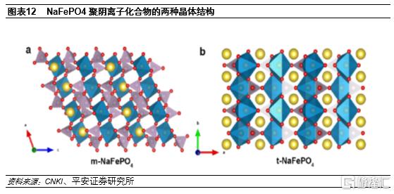 聚阴离子化合物正极材料(表达式NaxMy[( XOm) n-]z( M 为具有可变价态的金属离子; X 为P、S 和V 等元素))是由钠、过渡金属以及阴离子构成。其中过渡金属主要有铁、钒、钴等,而阴离子主要包括磷酸根、焦磷酸根、氟磷酸根和硫酸根。