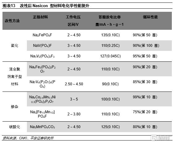 针对比容量和导电性低的问题,聚阴离子化合物正极目前主要通过碳材料包覆、氟化、参杂、不同阴离子集团混搭、尺寸纳米化及形成多孔结构等方式改性。如Nasicon阴离子化合物正极经过改性后,比容量和导电性有较大提升。