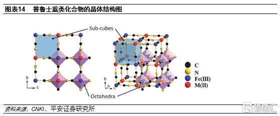 普鲁士蓝类化合物(表达式NaxMA[MB( CN)6]·zH2O( MA 和MB 为过渡金属离子))是由钠、过渡金属和氰根构成的化合物。普鲁士蓝化合物正极材料拥有面心立方晶体结构,过渡金属离子与氰根离子形成六配位,钠离子处于三维通道结构和配位孔隙中,为可逆嵌脱提供了良好的迁移通道。