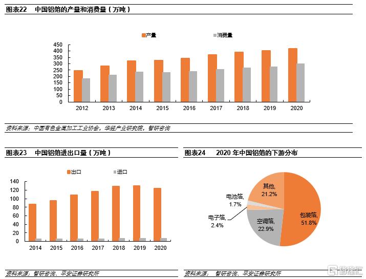 中国是全球铝箔产销大国,铝箔产品齐全,具备完整的产业链,为电池铝箔的生产奠定了良好的基础。根据中国有色金属加工协会,2020年中国铝箔产量415万吨,同时中国也是铝箔的出口大国,2020年向全球各地出口铝箔123万吨。在国内需求方面,2020年中国铝箔的需求接近300万吨,应用领域分布在包装、空调、电子、电池等领域。