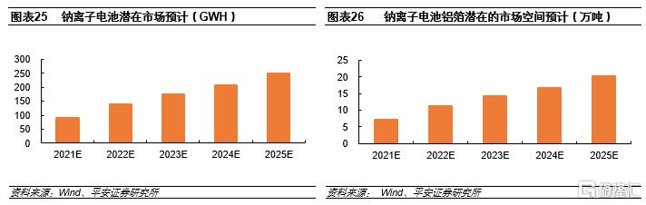 未来钠离子电池发展将极大推升电池铝箔需求。根据平安电新组预测,在储能、低速交通工具和部分低续航电动汽车领域实现替代下,2025年钠离子电池的潜在的市场容量约为250GWH。目前锂电池铝箔的单位用量300~700吨/GWH,由于钠电池和锂电池铝箔较为接近,且正负极集流体均采用铝箔,我们按800吨/GWH测算,则钠离子电池铝箔2025年的潜在市场需求可达20万吨。