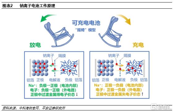 钠离子电池与锂离子电池工作原理类似,与其他二次电池相似,钠离子电池也遵循脱嵌式的工作原理,在充电过程中,钠离子从正极脱出并嵌入负极,嵌入负极的钠离子越多,充电容量越高;放电时过程相反,回到正极的钠离子越多,放电容量越高。
