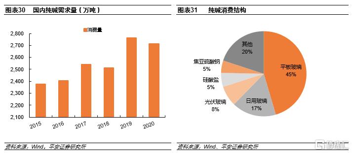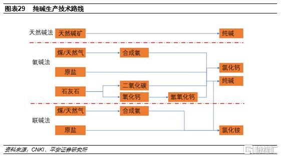 纯碱是常用的大宗化工原料之一,技术路线成熟,纯碱的生产工艺主要有天然碱法、氨碱法与联碱法,三种生产工艺在国内的产能占比分别为6%、45%和49%。天然碱法的生产原料主要是天然碱矿,生产工艺简单,成本低,我国天然碱法生产主要集中在河南和内蒙古。氨碱法最早为比利时人索尔维研发,目前仍是我国纯碱的生产工艺之一,但是三废排放较大。联碱法是我国化学工业的先驱侯德榜博士发明,目前已经成为我国占比最高的纯碱生产工艺。