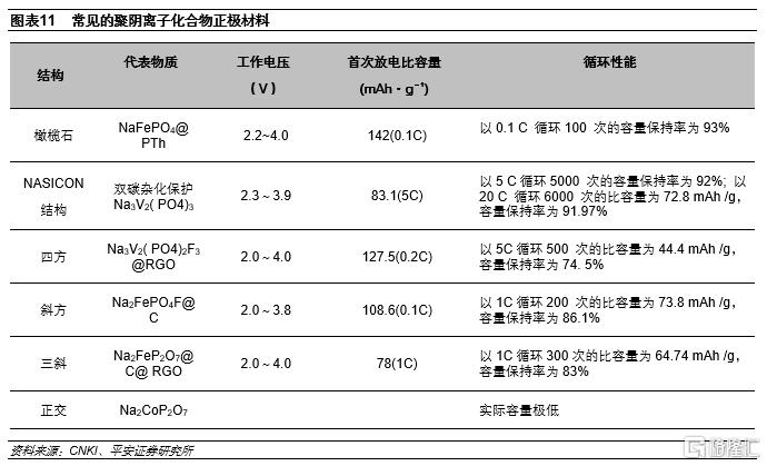 聚阴离子化合物正极材料中阴离子结构单元通过强共价键连成的三维网络结构,结构稳定性好,十分有利于钠离子的嵌脱,具有电压平台高,良好的热稳定性和结构稳定性,但也存在比容量较低和导电性偏低的缺点。