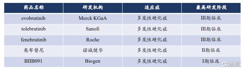 目前,赛诺菲、德国默克和罗氏的BTK抑制剂在MS适应症上研发进度最快,已经到达III期。渤健除了自研的一款BTK抑制剂在MS上处于 I 期临床外,还在7月13日以9.4亿美元的交易获得了诺诚健华奥布替尼在MS领域全球独家权利,以及除中国(包括香港、澳门和台湾)以外区域内的某些自身免疫性疾病领域的独家权利。