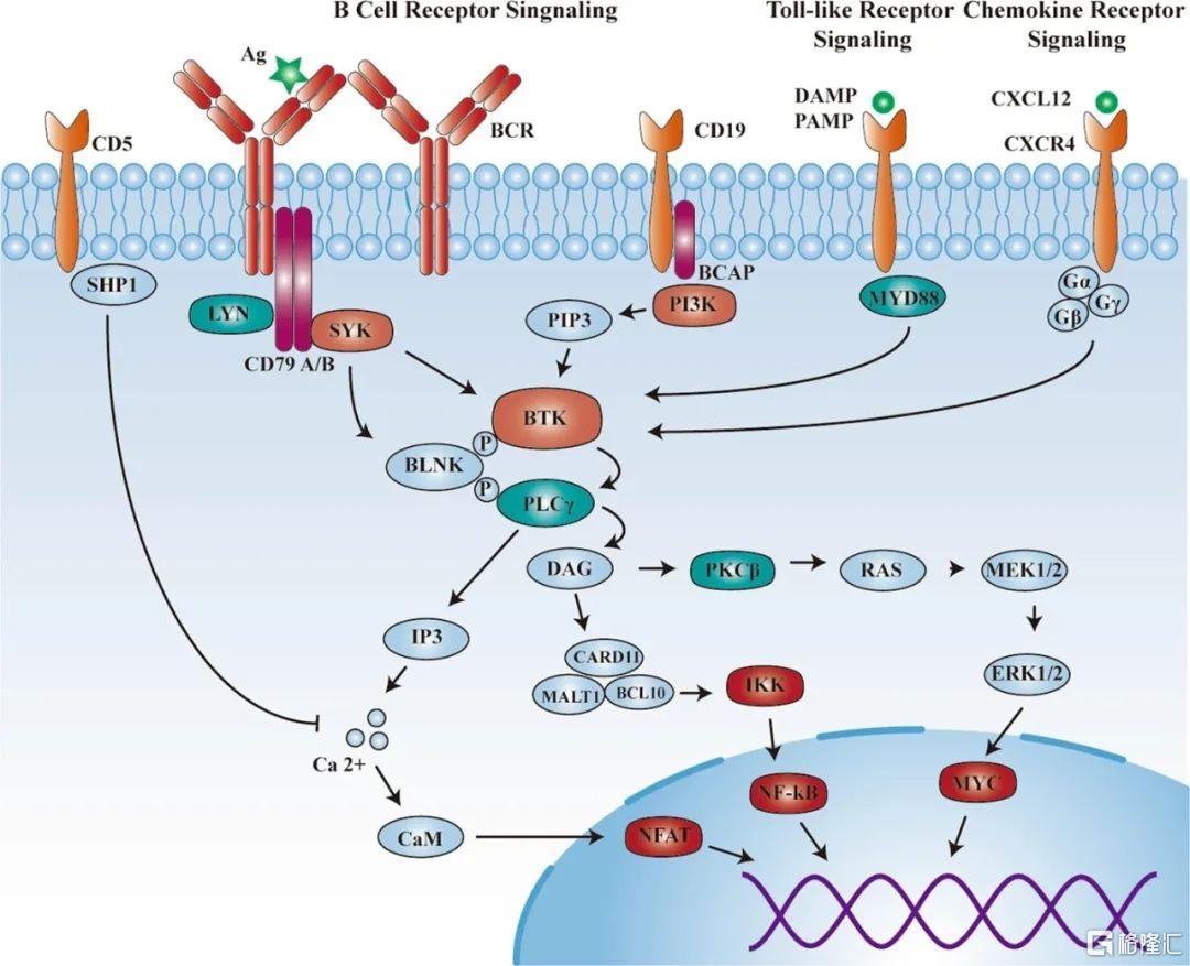 在抗原依赖性BCR信号中,BTK可被PI3K或SYK激活,发挥调节B细胞增殖和存活的作用。在抗原非依赖性TLR信号中,大多数TLR招募MYD88以对TLR配体细菌脂多糖产生应答。在趋化因子受体信号转导中,在骨髓和生发中心高度表达的CXCL12通过BTK与CXCR4连接的异源三聚体G蛋白亚基直接相互作用,与CXCR4结合,诱导BTK活化。