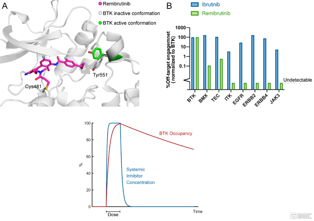 remibrutinib结合BTK无活性构象(A);remibrutinib相较于ibrutinib对其它激酶选择性具有非常大差异(B)(来源:J. Med. Chem)