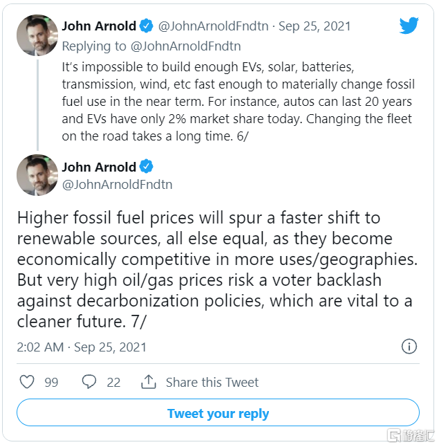 被视为世界上最顶尖商品交易员之一的约翰•阿诺德(John Arnold)近日在twitter上警吿,商品价格的飙升将会粉碎任何转向 "环保能源"的愿望。这也是ESG(环境、社会和治理)被认为可能引发能源恶性通货膨胀的原因。