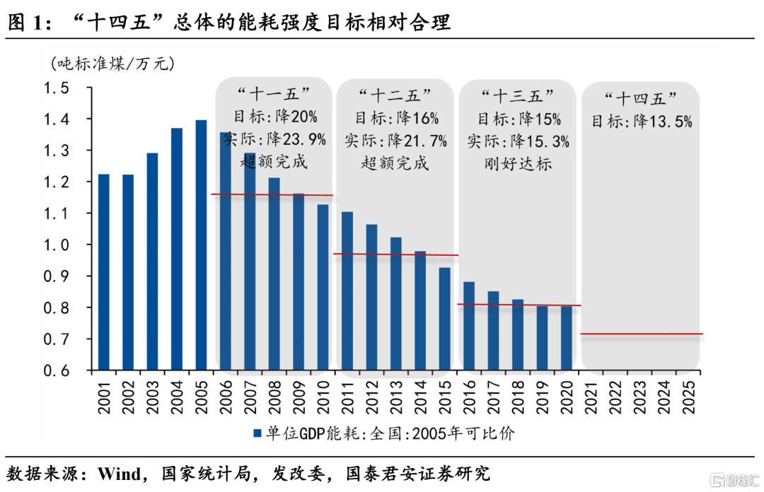 首先,“十四五”总体的能耗强度目标相对合理。回溯过去三个五年计划,“十一五”和“十二五”我国都超额完成了“双控”的目标,分别超出目标3.9%和5.7%,而“十三五”期间我国刚好踩线达标,主要是由于最后一年的疫情所致。随着我国经济增速的不断走低,能耗强度下降的难度逐渐提升,“十四五”13.5%的目标总体来说还是符合能耗约束的走势规律。